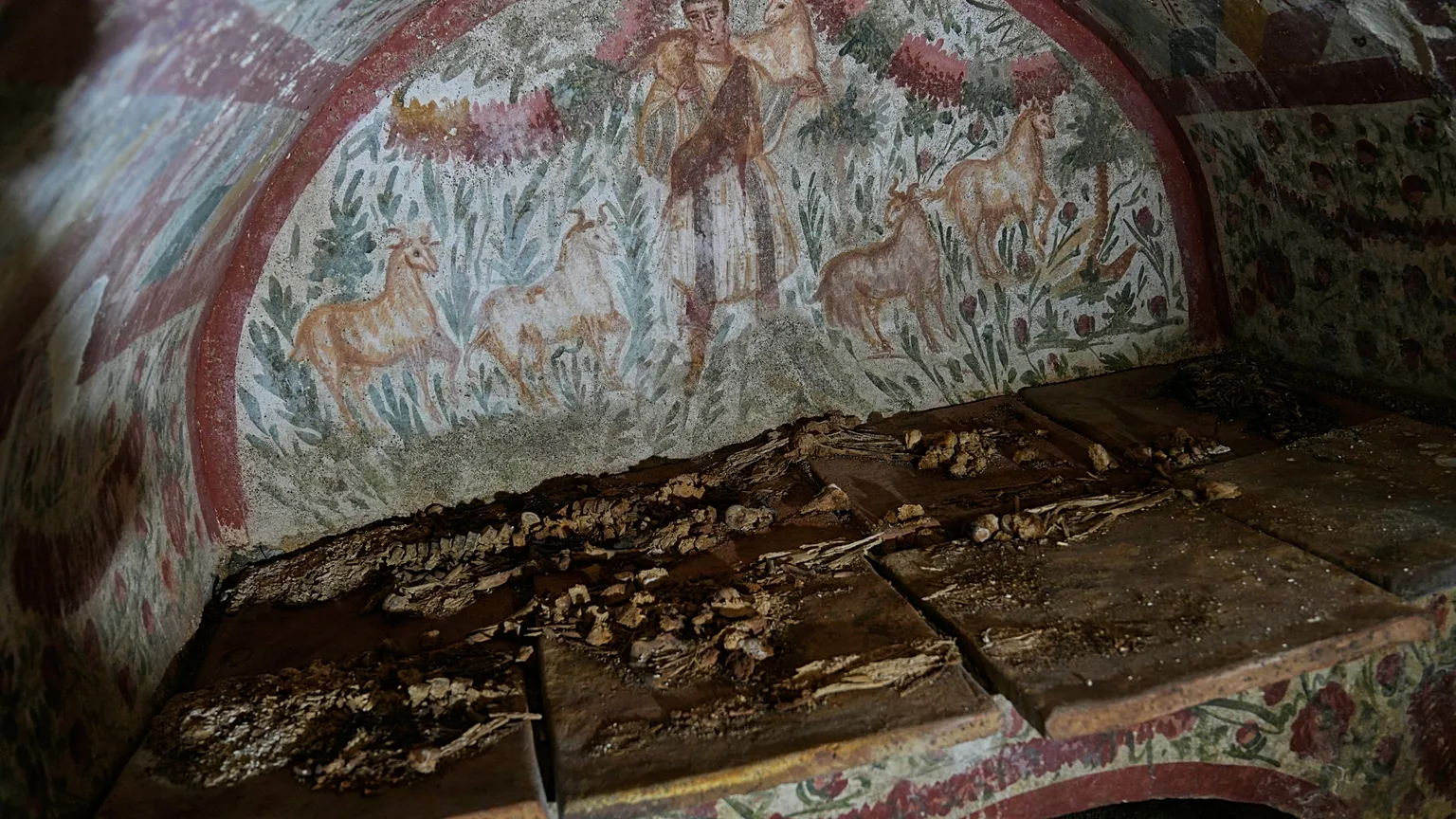 L’affresco del Buon Pastore raffigura un Gesù giovane vestito con una toga, che porta sulle spalle una capra.